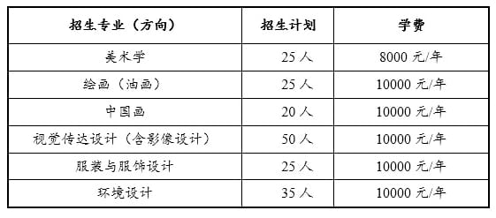 注:视觉传达设计含有视觉传达设计(35人)和视觉传达设计(影像设计)(15人)两个专业方向,入校后根据校考成绩与志愿相结合的原则按照相应的计划数进入到相应专业学习。影像设计专业方向学生须自备数码单反相机。